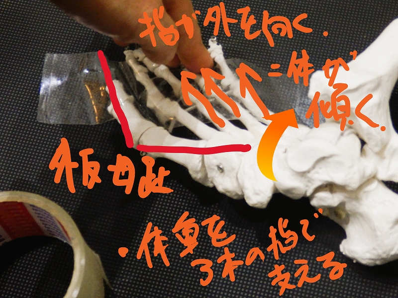 踵が斜めに上がり、足の甲が捻られると、指は外に向き、指の間は開き気味になります。