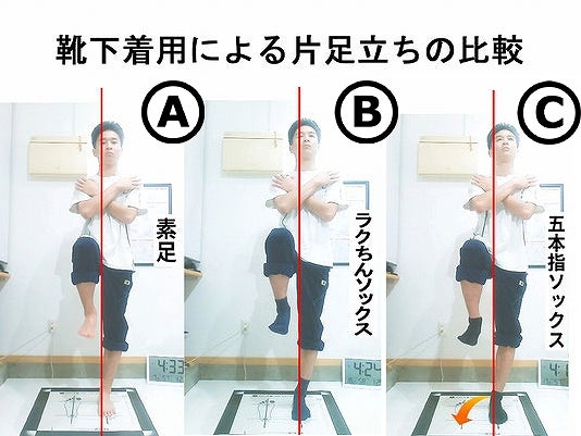靴下の違いでも、片足立ちのバランスは大きく変わります。