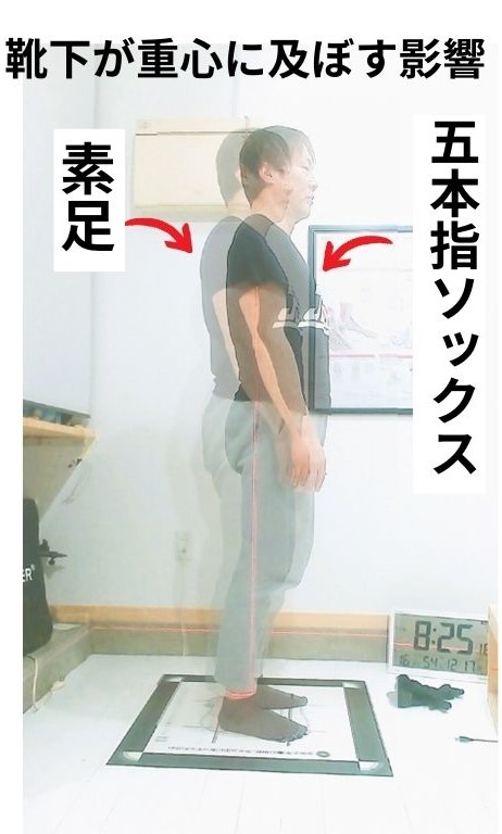 素足のときと靴下を履いたときの立ち姿勢の違いを比較したものです。