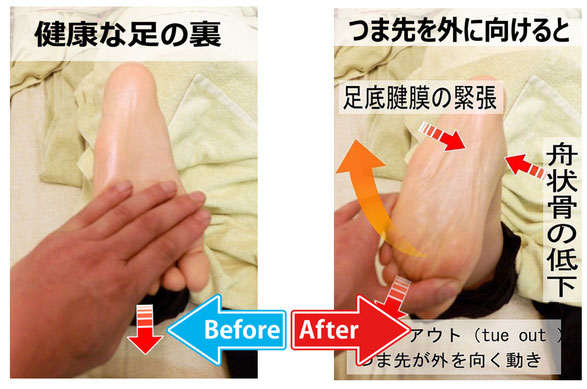 つま先の向きが外を向くと足底腱膜は固くなります。